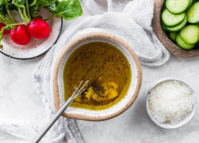 - Dijon mustard– the mustard acts as an emulsifying agent and helps the oil and vinegar stay together.