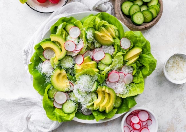 Gently wash and dry the butter lettuce, then tear or leave the leaves whole depending on your preference. Add them to a large serving bowl along with cucumber, radish, avocado, and any other fresh vegetables.