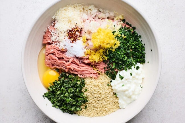 - In a large bowl, combine the ground turkey, panko, cottage cheese, Parmesan cheese, egg, shallot, garlic, parsley, basil, lemon, salt, and crushed red pepper flakes.