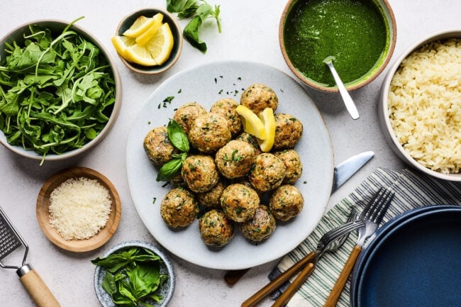 The meatballs are incredibly versatile too. I love serving them in a bowl with rice, peppery arugula, a drizzle of basil vinaigrette, and a sprinkle of Parmesan, but they’re just as tasty alongside roasted vegetables, tossed with pasta, or on top of a hearty salad for lunch or dinner.