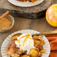 - Enjoy! The cobbler is good on it’s own, but I highly recommend serving it warm with vanilla ice cream and a drizzle of salted caramel sauce. YUM!