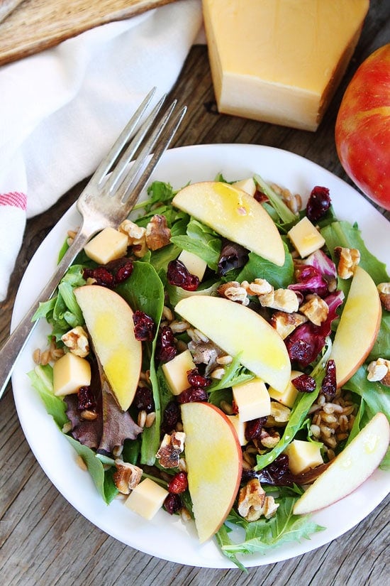 I top mixed greens with apple slices, Gouda, farro, toasted walnuts, dried cranberries, and a simple apple cider vinaigrette. Yep, this salad has it all!