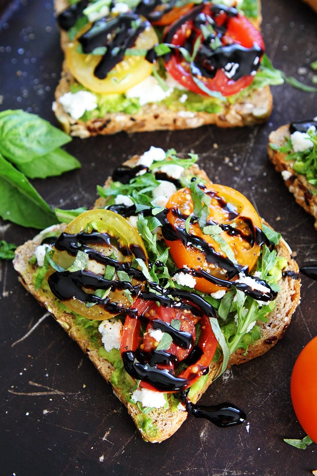 - Spread the mashed avocado evenly onto toasted bread slices. Top with arugula and tomato slices. Crumble the goat cheese over the top and sprinkle with fresh basil. Season with additional salt and pepper, if desired. Drizzle with balsamic glaze and serve immediately.