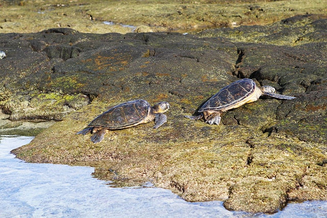 The resort is a mix of white sandy beaches, black lava landscapes, large ponds, golf course, and lush green foliage.