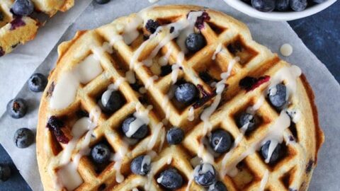 These light and fluffy Blueberry Sour Cream Waffles with a sweet maple glaze are perfect for breakfast or brunch. The waffles freeze well, so make a double batch!