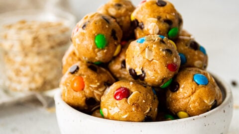 Easy, no-bake protein balls that will remind you of your favorite monster cookies! They only take 10 minutes to make and are the perfect grab and go snack!