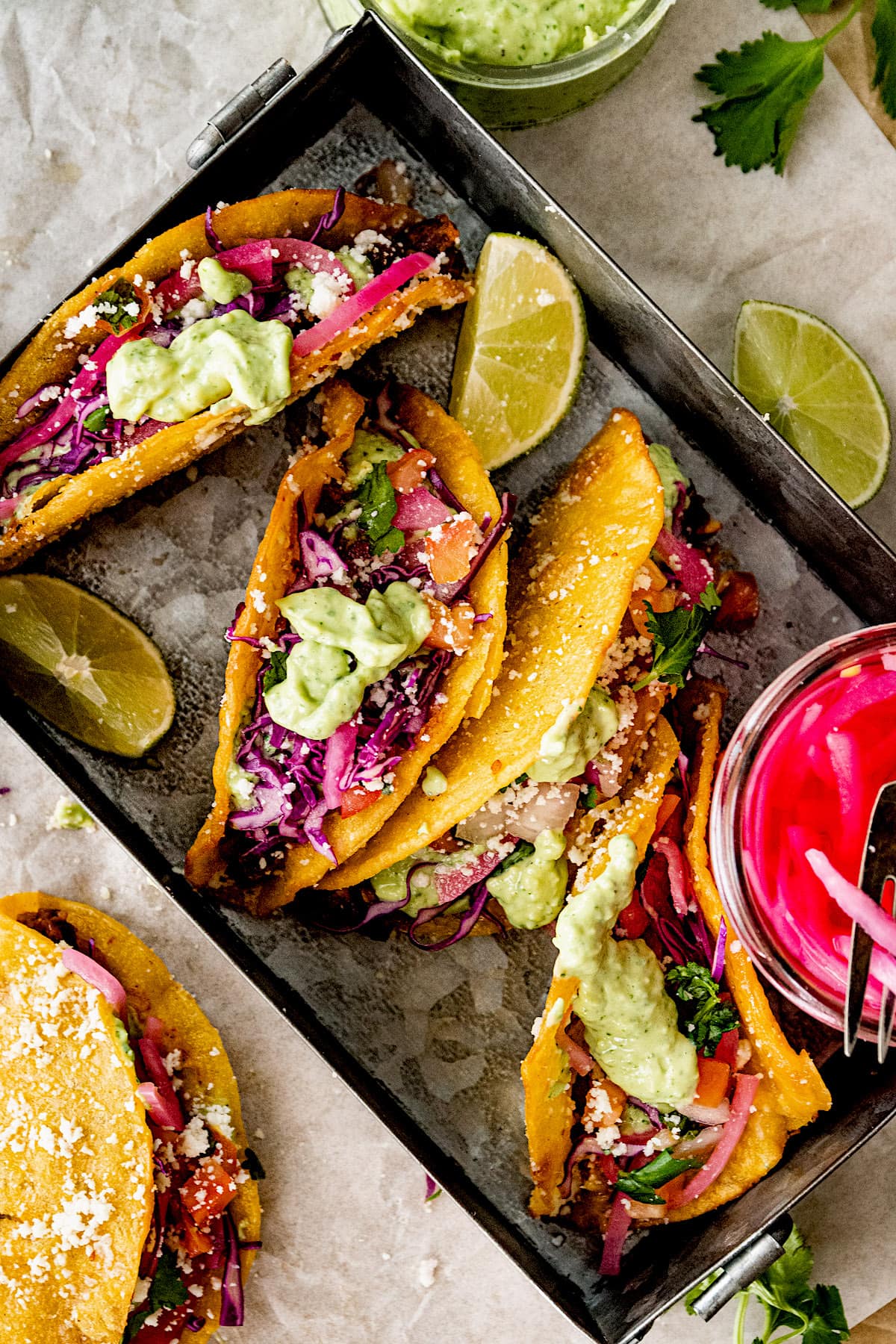 - To assemble the tacos: Spoon the black beans into the center of the crispy tortillas. Top with the creamy avocado sauce, cheese, shredded cabbage, pickled red onions, pico de gallo, cilantro, and a little cotija cheese (or whatever toppings you like). Serve immediately.