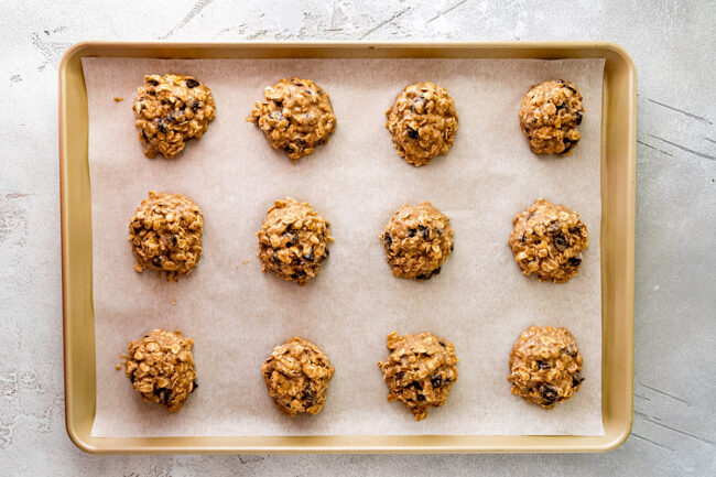 - Form the cookies. Using a cookie scoop or spoon, form the dough into round cookie shapes, about 2 tablespoons per cookie, and place them on the prepared baking sheet.