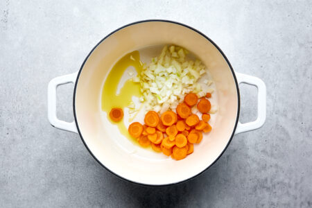 - In a large pot, heat the olive oil over medium high heat. Add the onion and carrots and cook until tender, about 5 minutes, stirring occasionally. Add the garlic and cook for one minute.
