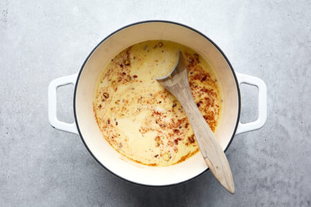 - Melt butter in a hot pan and whisk in flour to make a roux (that just means you’ve created a sauce with butter and flour that will thicken the final product!).