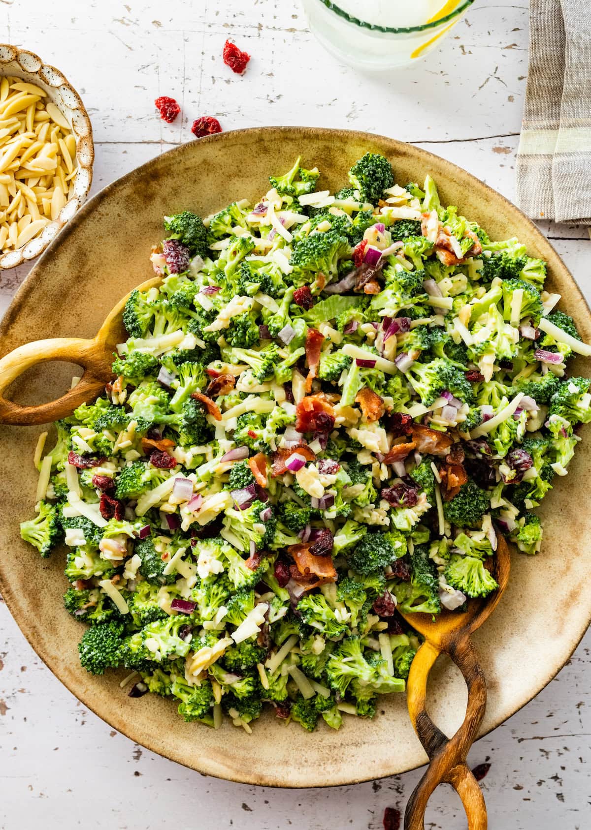 This classic Broccoli Salad recipe is made with fresh broccoli, bacon, cheddar cheese, almonds, dried cranberries, onion, and a creamy homemade dressing. It’s the perfect side dish for cookouts, parties, and potlucks!