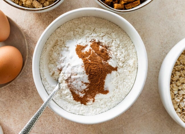 - In a medium bowl, whisk together the flour, baking soda, salt, and cinnamon. Set aside.