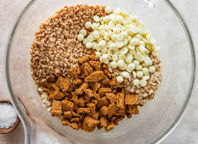 - Add the dry ingredients and mix on low until just combined. Don’t over mix. Stir in the oats, Biscoff cookie pieces, toffee bits, and white chocolate chips.