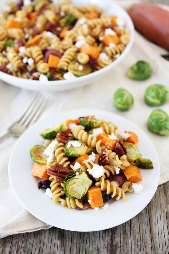 This pasta dish has all of my favorite fall ingredients: sweet potatoes, brussels sprouts, dried cranberries, pecans, and feta cheese. The simple brown butter sauce brings all of the flavors together to create one amazing meal!