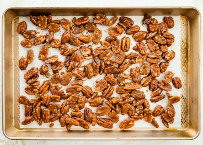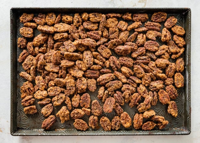 - Remove from the oven and let the pecans cool on the baking sheet. When completely cool, store in an airtight container or jar.
