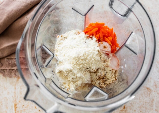 - Add ingredients to blender. In a high-powered blender, combine the shredded carrots, frozen banana, almond milk, cottage cheese, protein powder, oats, maple syrup, vanilla extract, cinnamon, nutmeg, and ice.
