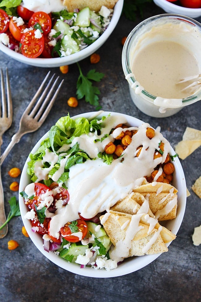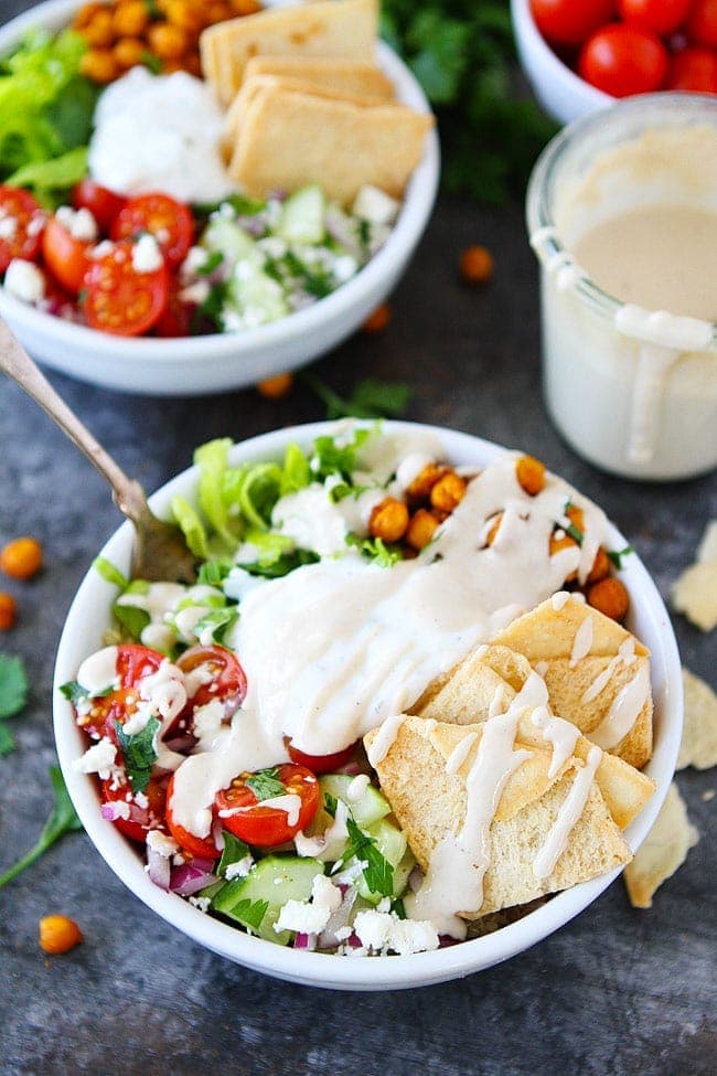 - Top the bowls with tomatoes, cucumbers, the roasted chickpeas, red onion, tzatziki sauce, pita chips, feta cheese, parsley, and the lemon tahini dressing.