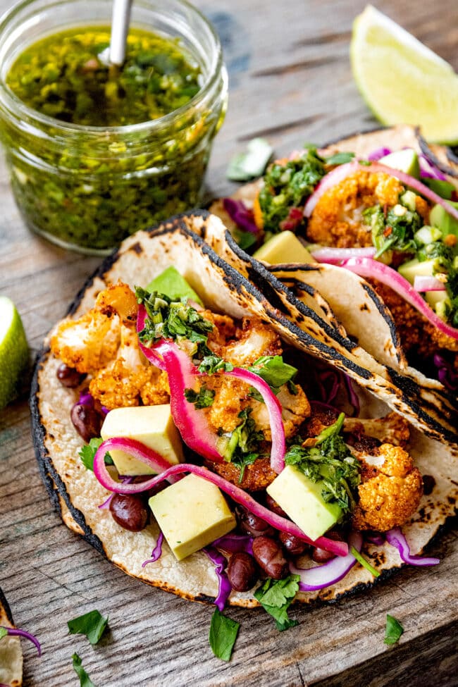 Chimichurri Cauliflower Tacos- tacos with spiced roasted cauliflower, beans, and a zesty chimichurri sauce! Top with avocado, cabbage, and pickled red onions for the most flavorful vegetarian tacos ever!