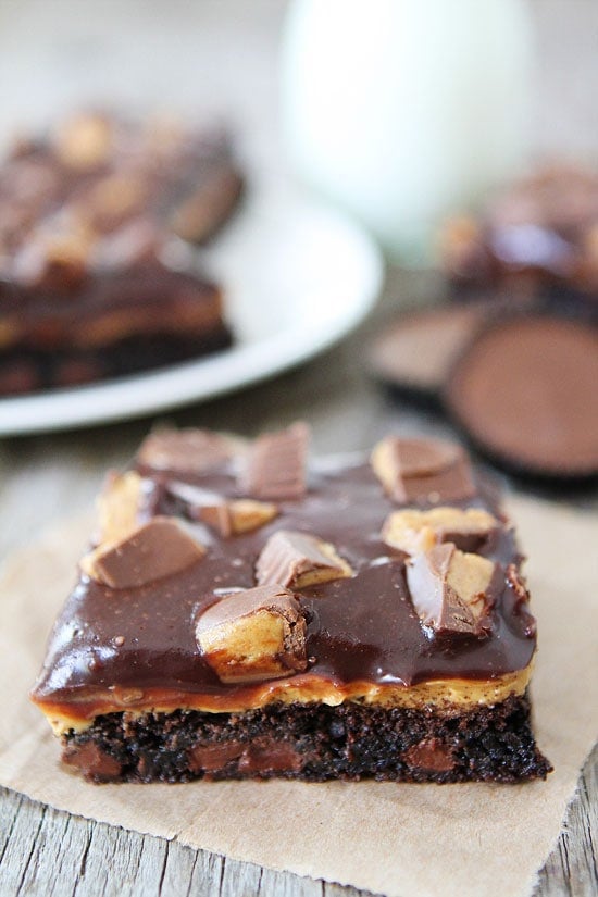 These chocolate peanut butter brownies are rich, fudgy, and every chocolate lover’s dream. I would be content with just the brownie layer, but does Jess stop there, NO! She adds a peanut butter filling, chocolate ganache topping, and chopped up peanut butter cups on top! Chocolate and peanut butter brownies BLISS!