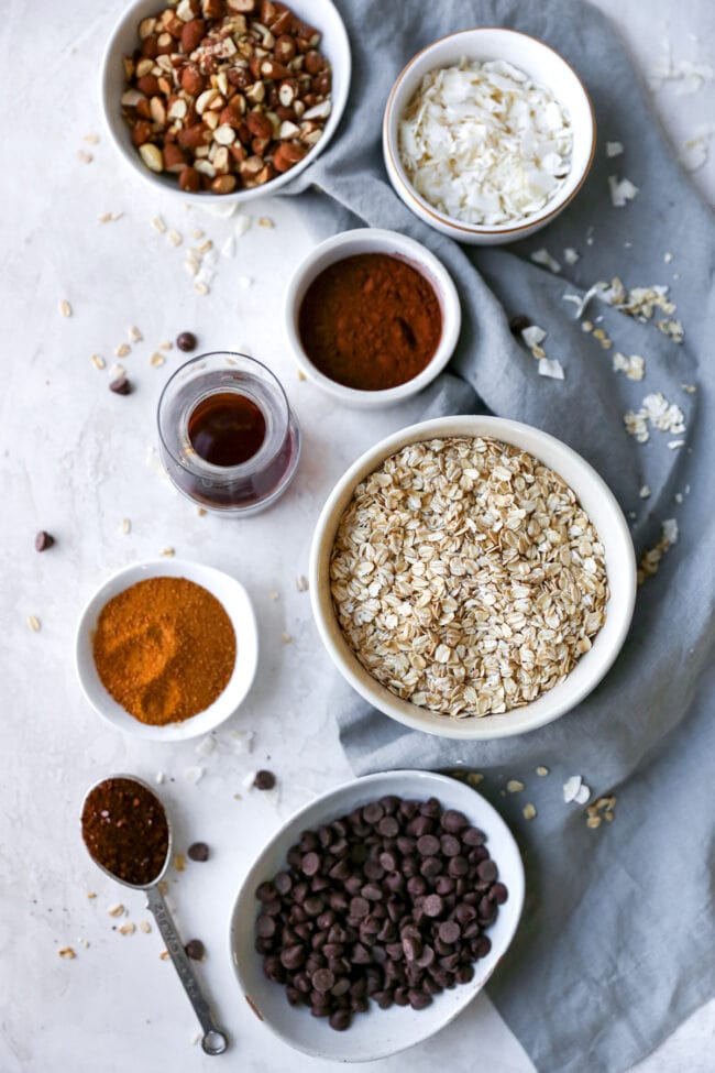 - Combine the dry ingredients first! Oats, almonds, coconut flakes, cocoa, sugar, espresso powder, and sea salt. I love how all of these ingredients look mixed together!