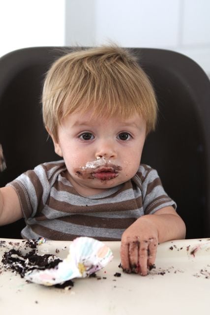 I decided to not make a cake at all:) For my birthday, we celebrate with cookies and for Josh’s birthday we celebrate with key lime tart, so cake really isn’t a tradition in our family. I knew Caleb would just make a mess of whatever we made him, so I kept it simple and made Chocolate Icebox Cupcakes. They are super easy to make and perfect for a one year old to destroy!
