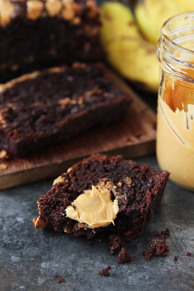 The chocolate banana bread alone is absolute perfection, but when you add in a swirl of creamy peanut butter and peanut butter chips on top, talk about trouble. I couldn’t stop myself!
