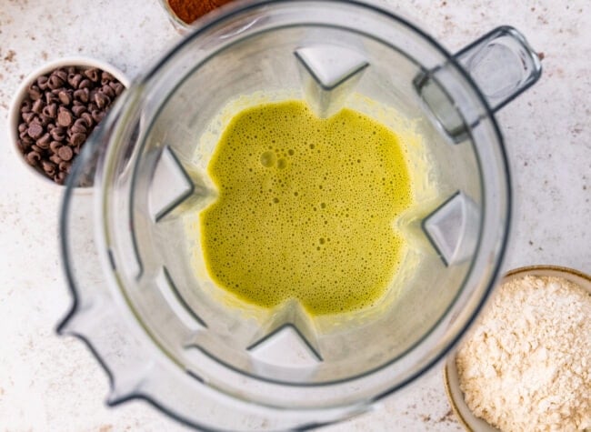 - Pour the blended wet mixture into the dry ingredients and stir just until combined. Fold in the chocolate chips.