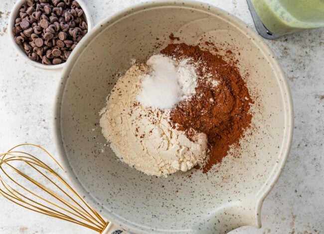 - In a large bowl, whisk together the flour, cocoa powder, baking powder, baking soda, and salt.