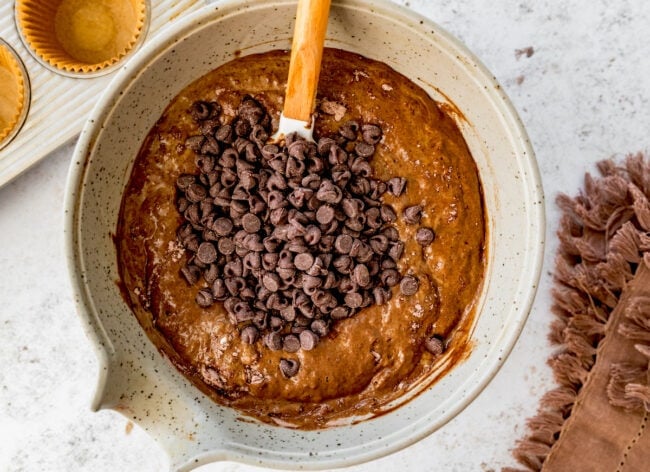 - Add chocolate chips last: Fold them in gently and sprinkle a few on top for a bakery-style finish. Plus, it makes them look extra tempting
