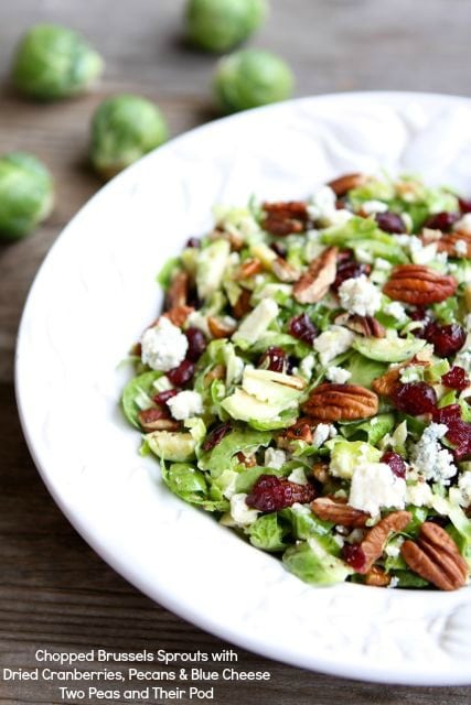 - 4. Add the toasted pecans, dried cranberries, and blue cheese to the chopped brussels sprouts. Pour the dressing over the salad and toss until all of the ingredients are well coated. Serve immediately.
