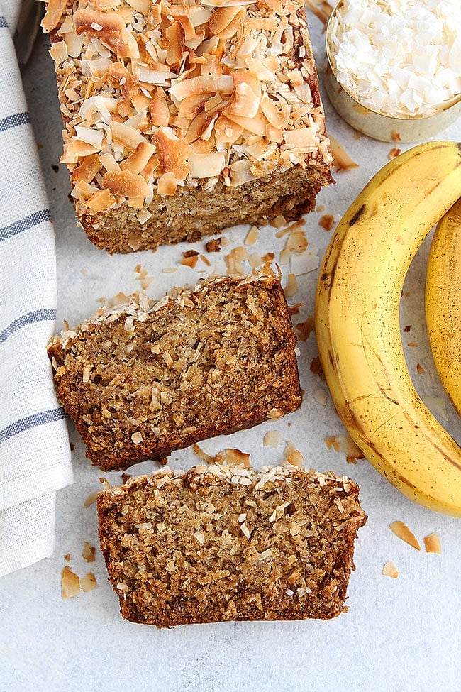 It really is the ultimate coconut banana bread. The coconut flavor shines throughout the entire loaf. Coconut lovers, get out your brown bananas, coconut, and let’s make some banana bread!