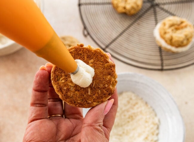 I’ve tested a lot of sandwich cookies over the years, and texture is everything. You want cookies that are sturdy enough to hold that dreamy cream filling, but still soft and tender when you take a bite. These strike that perfect balance. The oats give them structure, the coconut keeps them moist, and the filling is light, fluffy, and not overly sweet.