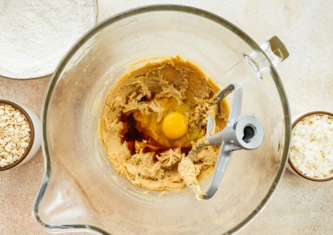- In a large bowl using a hand mixer or a stand mixer fitted with a paddle attachment, beat the butter, brown sugar, and granulated sugar together on medium-high speed until light and creamy. Add the egg, vanilla extract, and coconut extract and mix until smooth.