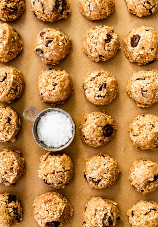My version includes brown butter, which we know makes everything better, oats, toasted coconut, a hint of cinnamon, pecans, and puddles of semi-sweet chocolate. Oh, and of course I finish the cookies with flaky sea salt.