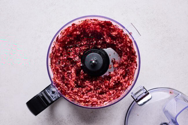 - Pulse in a food processor. Rinse the cranberries and discard any that are mushy or bruised. Place cranberries in a food processor and pulse until finely chopped but not pureed. You want the cranberries to have some texture. If you don’t have a food processor you can use a blender, but the texture won’t be the same. Try not to over blend. I don’t recommend chopping cranberries with a knife, they will roll all over the place. The food processor is BEST!