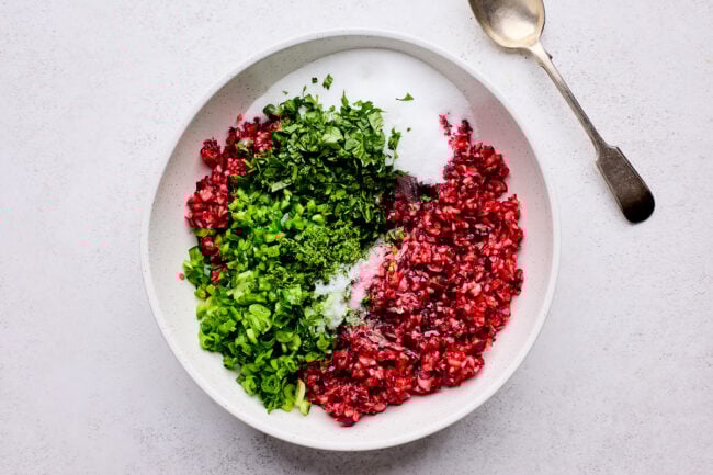 - Mix together. In a medium bowl, stir together the cranberries, sugar, cilantro, jalapeño, green onions, lime zest, lime juice, and salt.