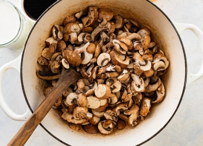 • Cook off the mushroom liquid. Wait until most of it evaporates before moving on.
