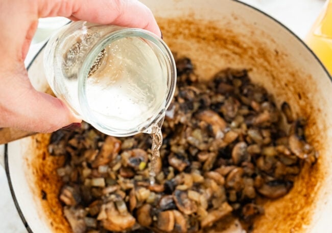 • Deglaze: Add white wine, scraping up any browned bits.