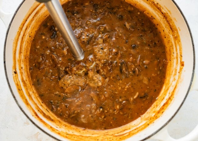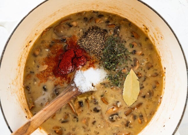 • Blend: Remove bay leaf. Use an immersion blender to partially blend the soup, blend about half of it to create a creamy base while leaving some mushrooms whole and chunky. This naturally thickens the soup and gives it a silky texture. If you don’t have an immersion blender you can carefully transfer about half of the soup to a regular blender, puree it, then return it to the pot. Make sure it’s cool enough or blend in batches to avoid splatters.