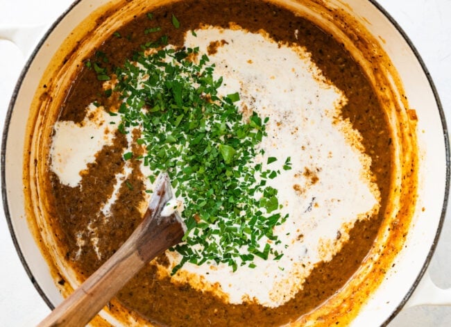 • Finish: Stir in milk (or heavy cream), yogurt (or sour cream), lemon juice, and parsley. Taste and adjust seasoning, if necessary.