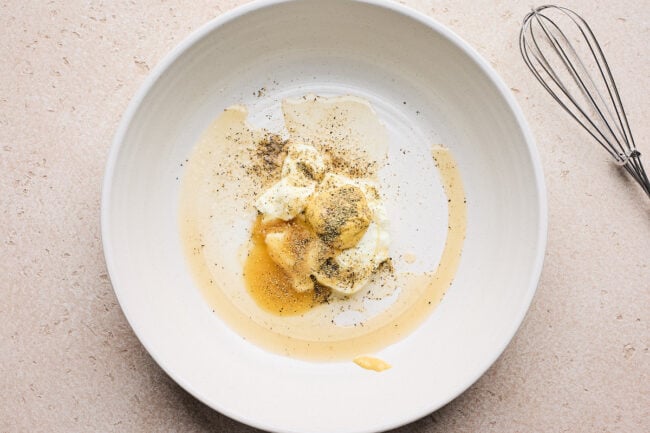 • In a large bowl, whisk together the Greek yogurt, apple cider vinegar, mustard, honey, salt, and pepper.