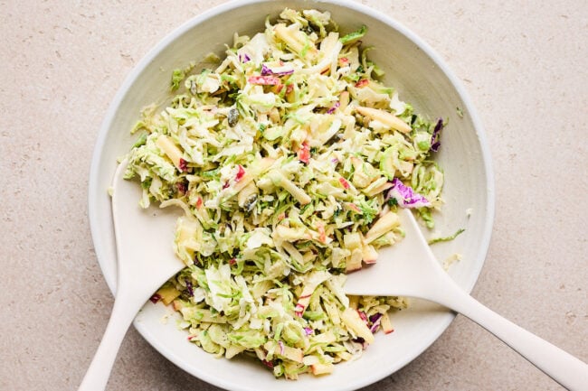 • Add the shredded brussels sprouts, cabbage, and green onions. Toss until evenly coated. Refrigerate while you make the chicken cutlets.
