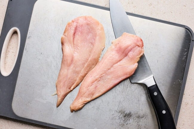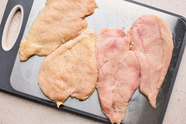 • Boneless, skinless chicken breasts: You’ll slice them horizontally and pound them thin so they cook evenly and stay tender.