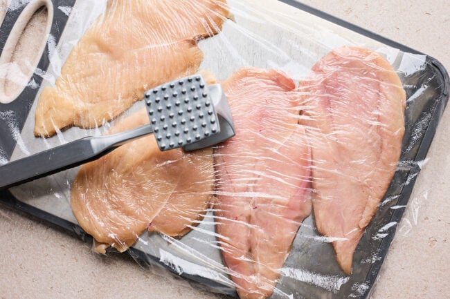• Cover the chicken with plastic wrap. Use a mallet or rolling pin to pound the chicken out until it is about 1/4-inch thick.