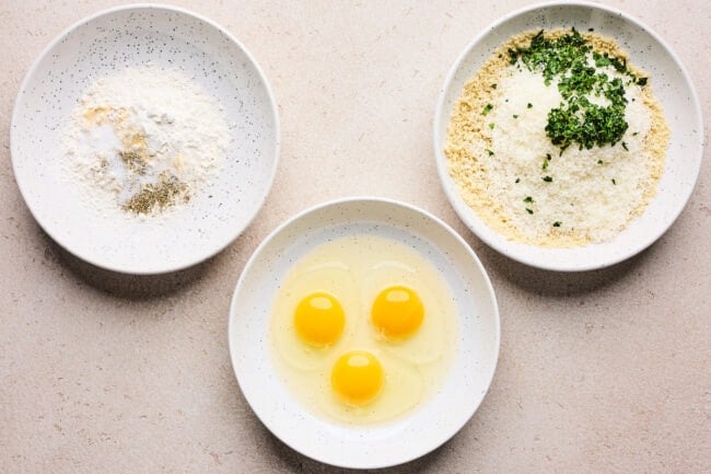 • In a medium shallow bowl or baking dish, combine the flour, garlic powder, ½ teaspoon salt, and ¼ teaspoon black pepper. Set aside. In a separate medium bowl or baking dish, whisk the eggs and set aside. In a third medium shallow bowl or baking dish, combine the panko, Parmesan cheese, and parsley.