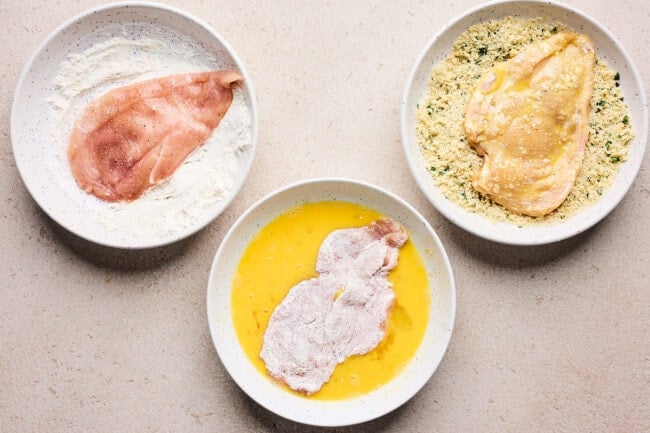 • Dredge the chicken breasts in the flour mixture, coating both sides, shaking off excess. Next, dip the chicken into the eggs, letting any excess drain off. Add the chicken to the panko mixture and press until both sides are well coated. Repeat until all pieces are all breaded.