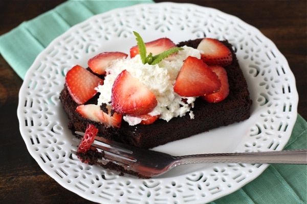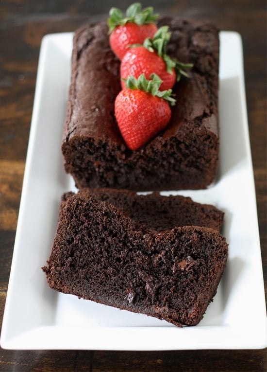 The chocolate loaf cake is incredibly moist and extremely decadent. We topped thick cake slices with whipped cream and strawberries. It was the perfect finish to this rich, chocolaty cake. The cake would also be good with a dusting of powdered sugar and a glass of cold milk or scoop of vanilla ice cream.