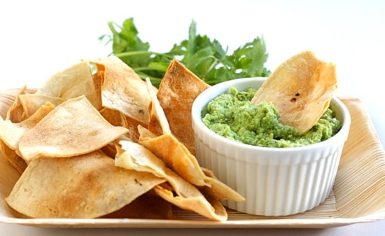 Josh was a little hesitant to try this guacamole-he thought the edamame would ruin one of his favorite dips, but he was pleasantly surprised. The edamame mixes in well with the avocado, keeping the bright green color. The guacamole is creamy, buttery, and delicious. Plus, it is good for you! This guacamole is full of protein, heart healthy fat, and fiber. We made homemade baked tortilla chips to scoop up our guacamole. It is also a great dip for cut up vegetables and I even like it as a sandwich spread.