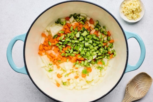 - In a large soup pot or Dutch oven, heat the olive oil over medium heat. Add the onion, carrots, and celery. Cook for 5 to 7 minutes, stirring occasionally, until veggies are tender. Add the garlic and cook for 1 minute.