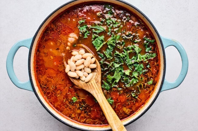 - Lower to a simmer and stir in the beans and kale. Let simmer for 3 more minutes, or until kale is wilted.